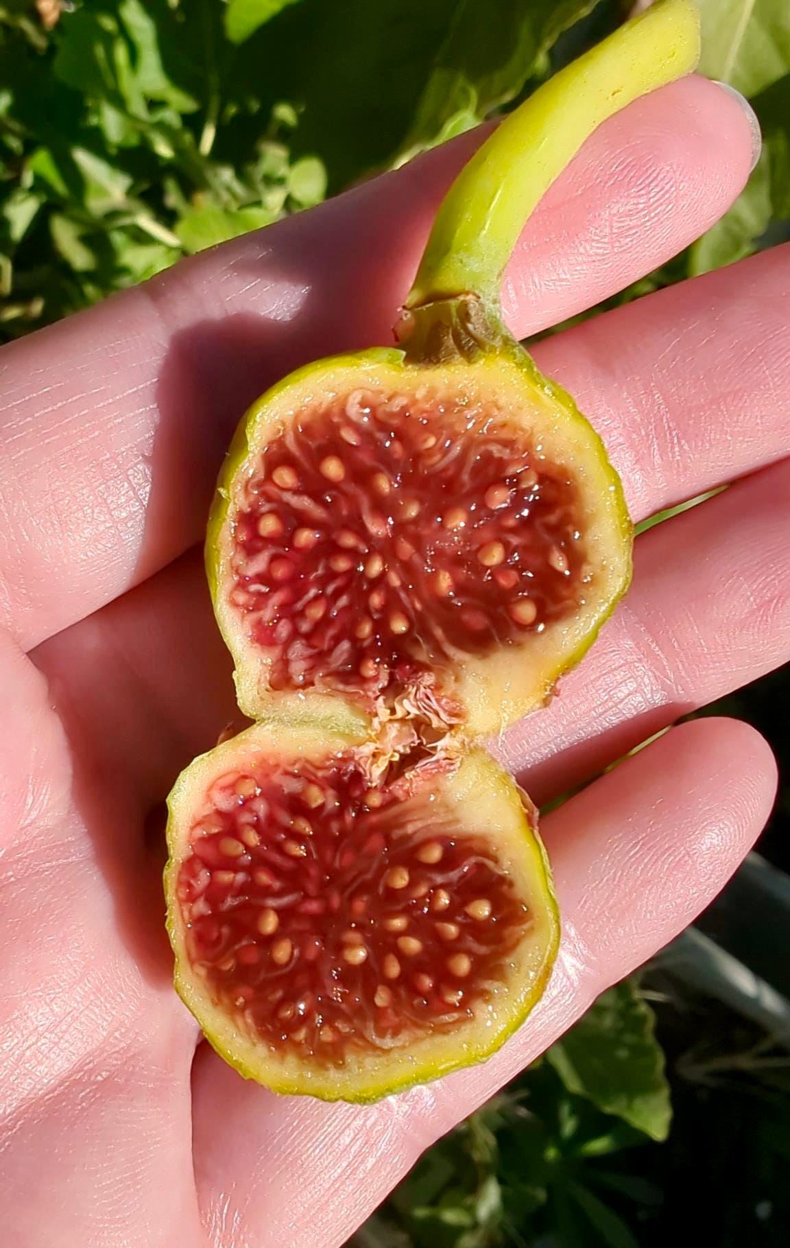 Figoin is a very small fig with a classic red berry flavor similar to that found in the Adriatic family of figs. It is early ripening which is fantastic for short season growers wanting a fig with this type of flavor. It also can be quite productive though the tree seems to stay relatively small in comparison to more vigorous varieties. The skin is yellow-green and the flesh a deep red.