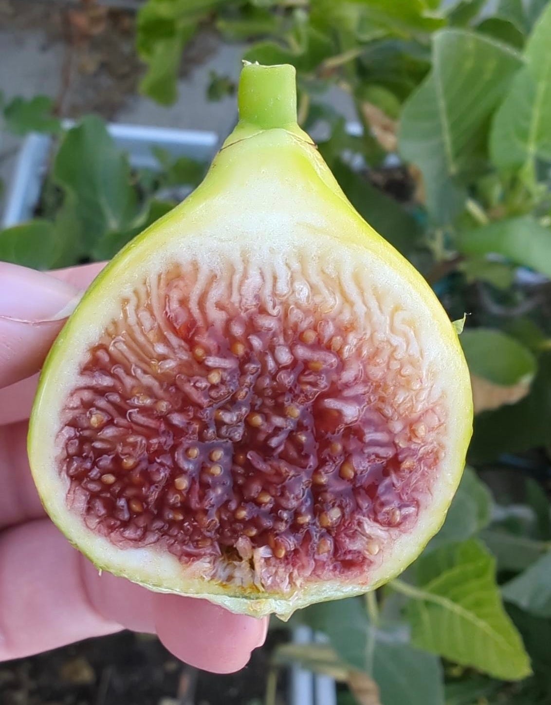 I am uncertain if mine were caprified, I didn’t test for it. It is unusual for me to have a whole tree of figs wasp pollinated, but pictures of this from the East coast look lighter than all of mine which has me thinking they were indeed pollinated. That of course influences my flavor description. One grower back East describes the taste as sweet, mild honey with tropical hints, even pineapple, and states that it is delicious. So who knows, maybe this fig is a two for one special? Hand pollinate a few and leave others not pollinated and see which you like best. Either way, you’re likely to have something yummy!