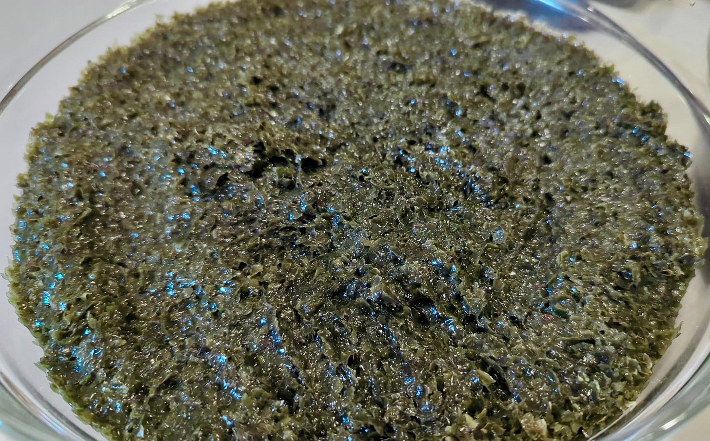 Since I did not have fresh seaweed, I used 4 lbs of dried seaweed flakes. I first rehydrated them by covering them with RO water. I topped off the water a couple of times until it didn't absorb anymore. I tried to keep it exact so that it would mimic fresh seaweed and did not want it swimming in excess water. My 4 lbs dried turned into about 22 lbs rehydrated, which was 10.05 kg. I wasn't expecting it to work out to the exact amount, but had an idea because a quick internet search said that dried seaweed could absorb water 5-10 times its weight.