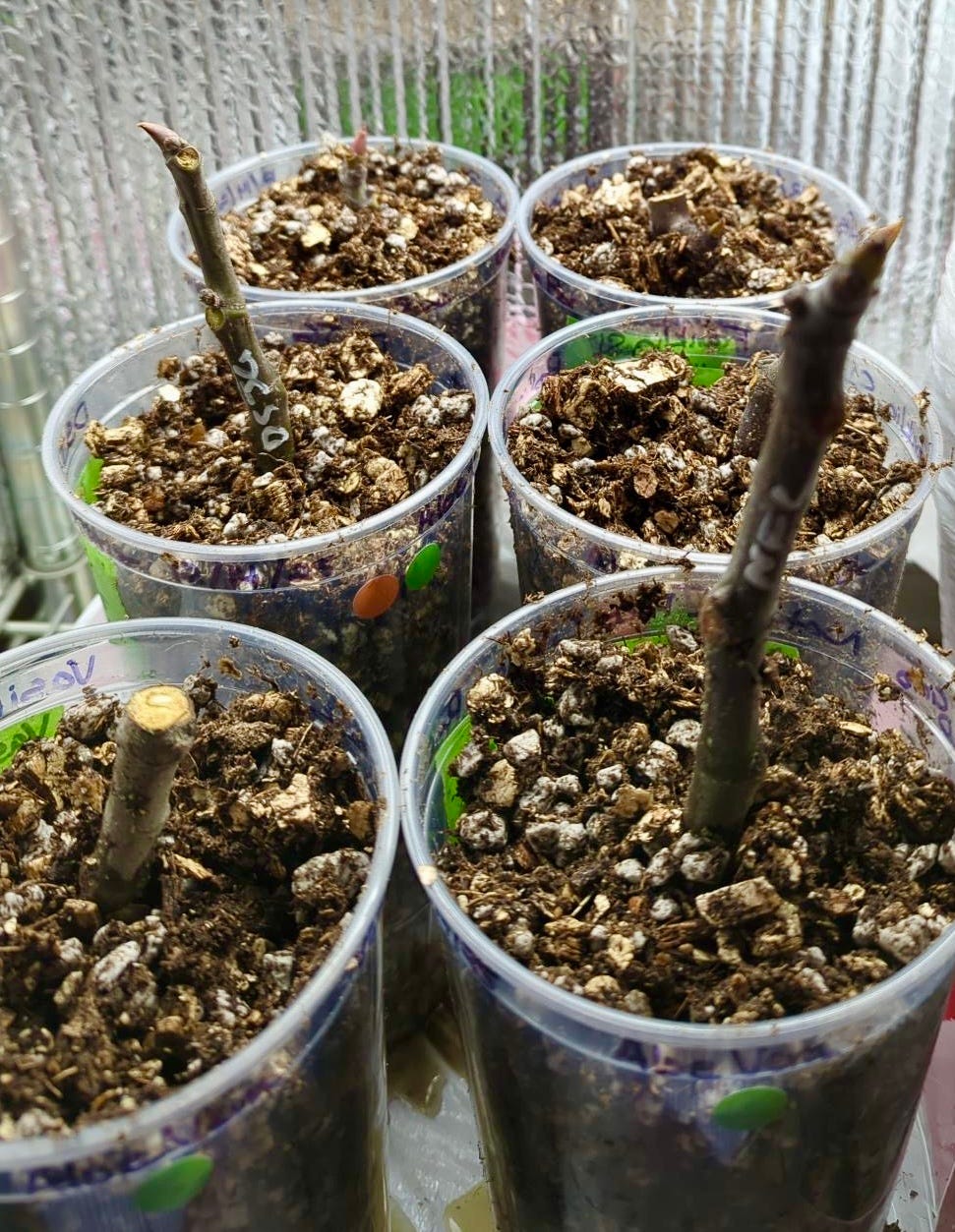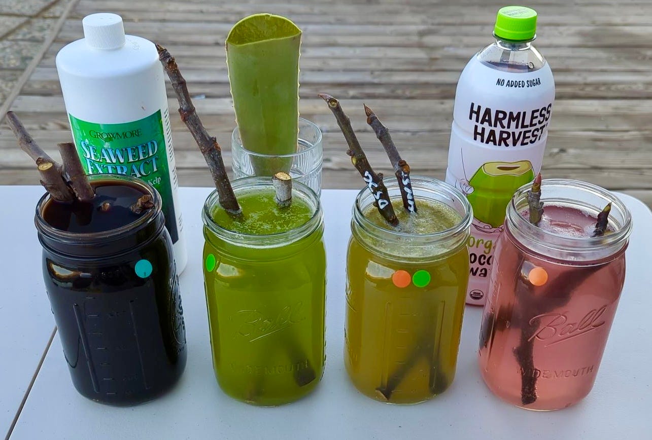 It was interesting though, I think the coconut water one and the aloe-coconut one started to ferment during the overnight soak. There were quite a few bubbles the next day. So that may be an argument for using a lower dilution, though I do not think it will harm the cuttings since I use ferments all of the time for soaking cuttings. I just know that you do not want it to develop much of a film on top as that can adversely affect them.